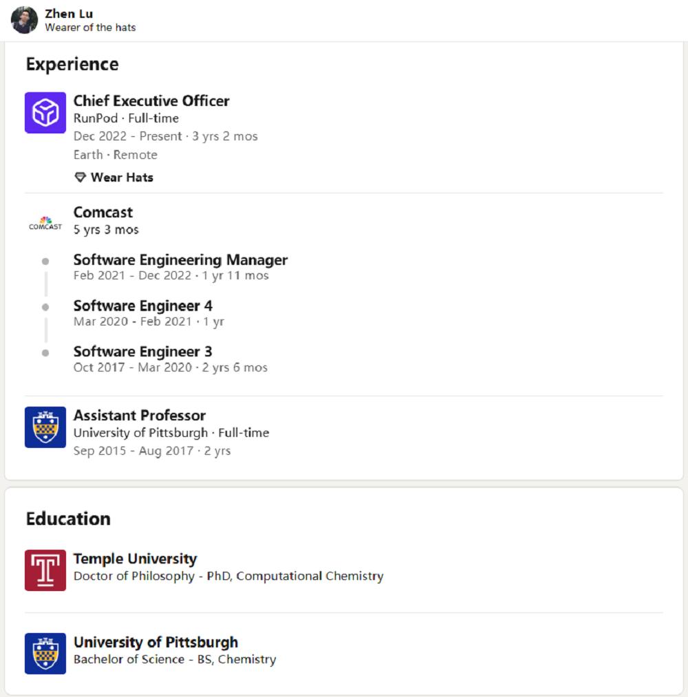 Pardeep Singh没有分享自己的教育背景。步入职场后,他一直在Comcast工作,直到与Zhen Lu联合创办RunPod。