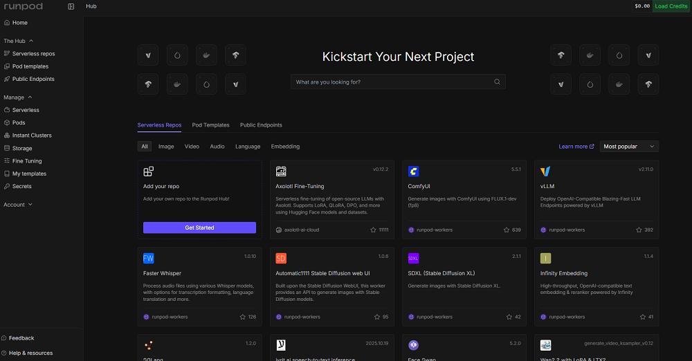 此外,该公司也提供开源AI的部署平台RunPod Hub。平台中,像是Whisper、ComfyUI、vLLM这样的常用AI模型、工作流和工具都被封装成标准件,点击后即可快速部署。