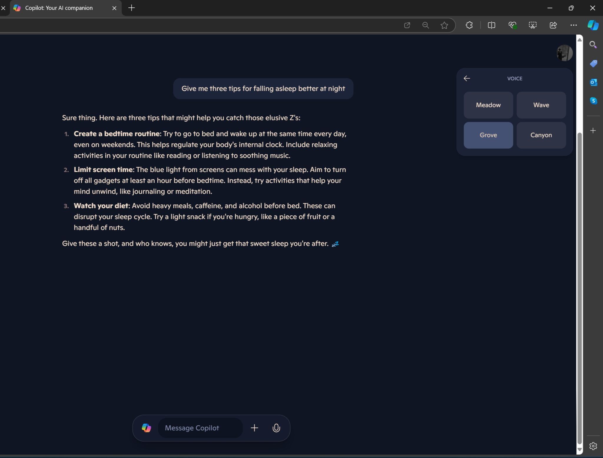 Copilot Daily 是一个 100% 人工智能生成的新闻播客,重点调用路透社等主流媒体的内容,以及网络上热门的新闻头条,共有 Meadow、Wave、Grove 和 Canyon 这 4 种播报语音。