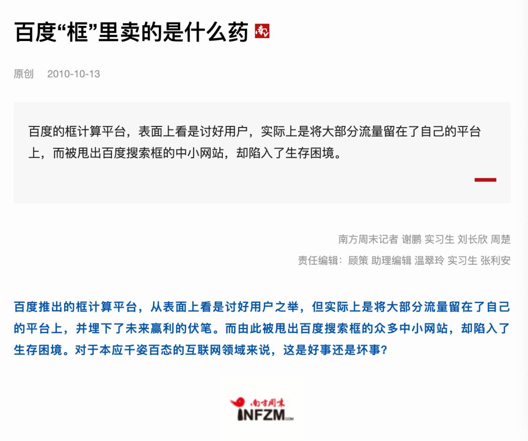 在当时框计算推出一年后,《南方周末》的报道直接指出这个生态悖论:用户虽然节省了搜索时间,但丧失了内容的客观和多样性,“百度本身的商业模式是非常依赖于互联网的百花齐放,否则最终搜索引擎变得没有用了,我们之所以需要搜索引擎,是因为互联网太庞杂了,一旦都是大网站了,我们还要搜索引擎干嘛呢?”
