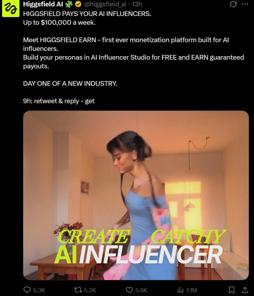 你会发现Higgsfield极度重视在X等平台的作品展示,并通过设立“创作者奖金”和官方转发优质案例来构建生态。它以“每周最高10万美元奖金”直接激励创作者产出内容,通过高额奖金池吸引用户参与。