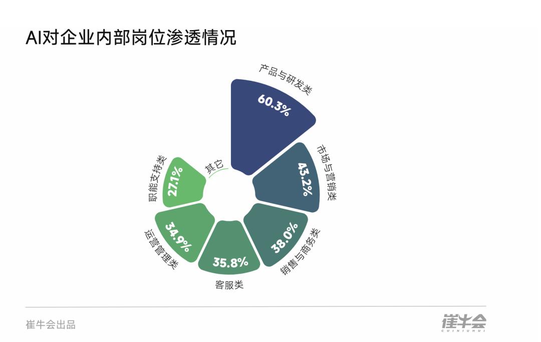 AI应用高度集中于产品与研发(60.3%)、营销、销售与客服等创收与创新核心环节 。职能支持类岗位(27.1%)这部分占比相对较低,恰恰预示着下一波效率红利将向这些中后台职能部门蔓延,通过流程自动化释放更大的运营效率红利 。