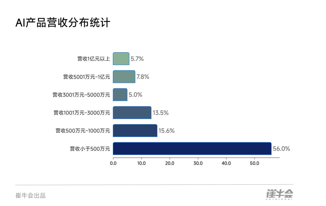 调研数据显示,AI产品年营收低于500万元的企业占比高达 56%,构成了行业金字塔庞大而脆弱的基座。
