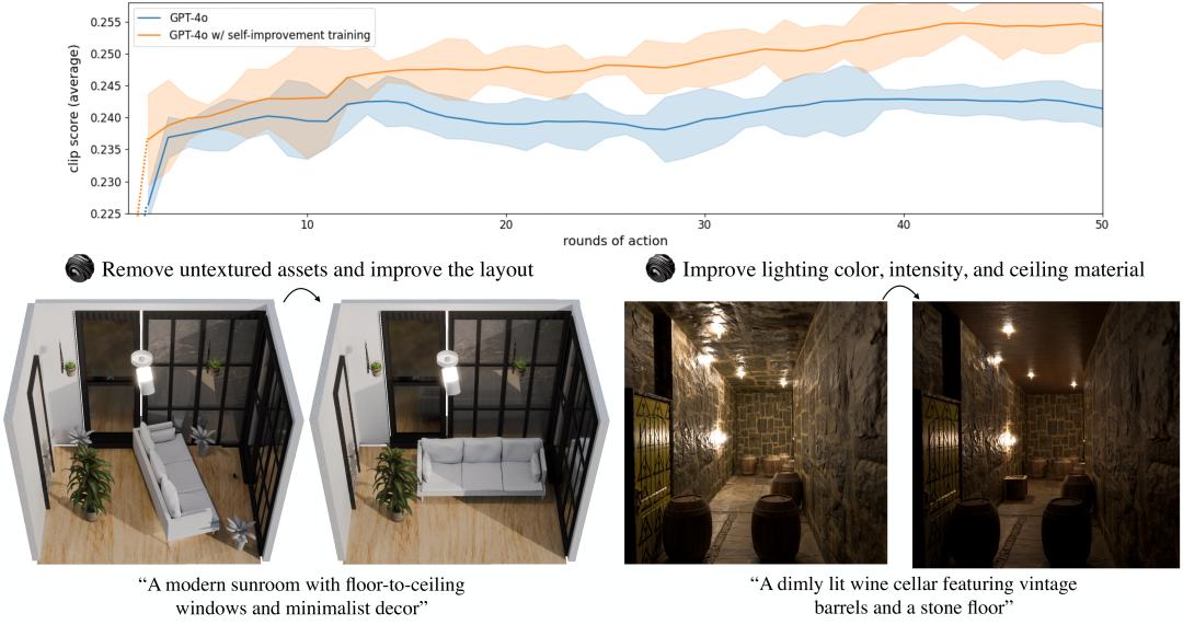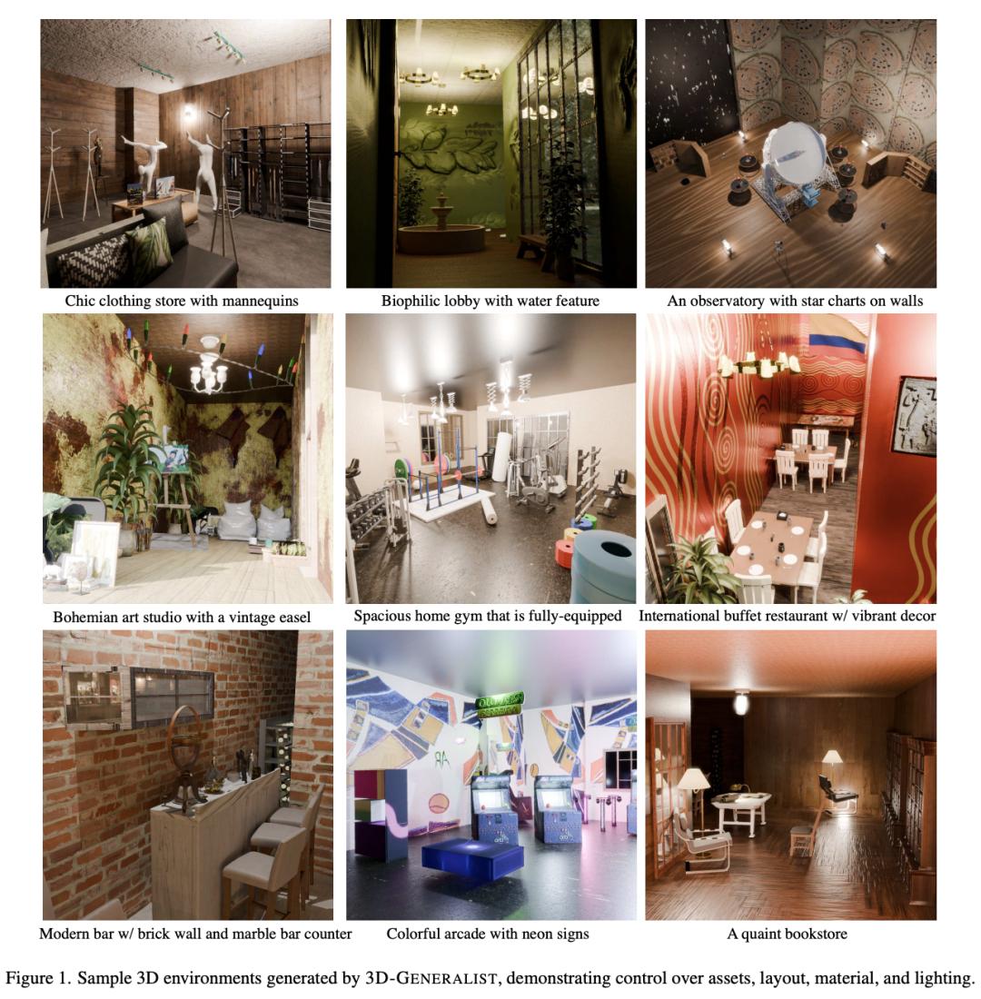 3D-Generalist采用视觉-语言-动作(VLA)模型来生成代码,用于构建与修改最终3D环境的各个方面(材质、光照、素材与布局)。