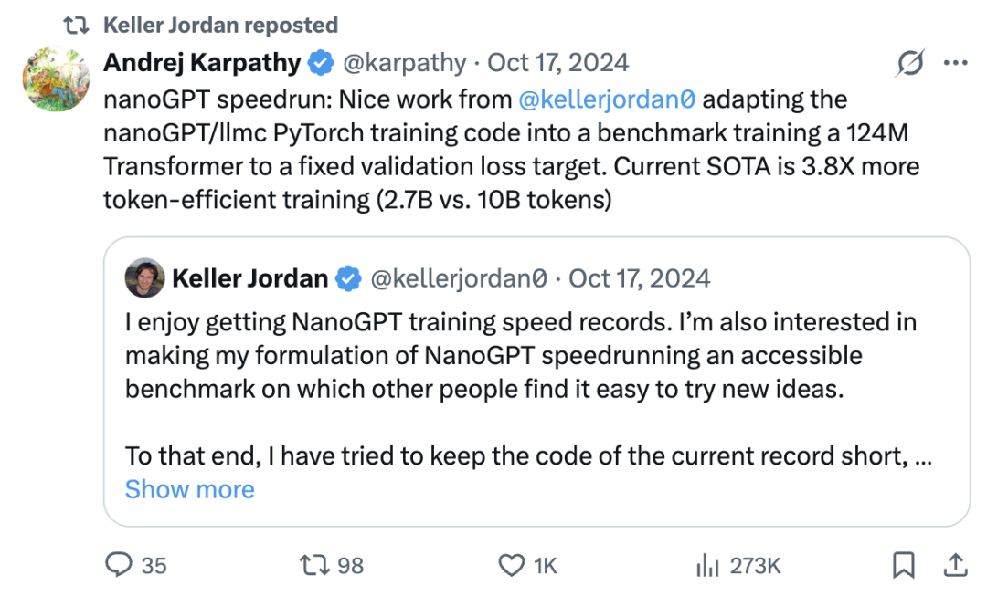 当时,Keller发起并持续更新了一个NanoGPT speedrun: