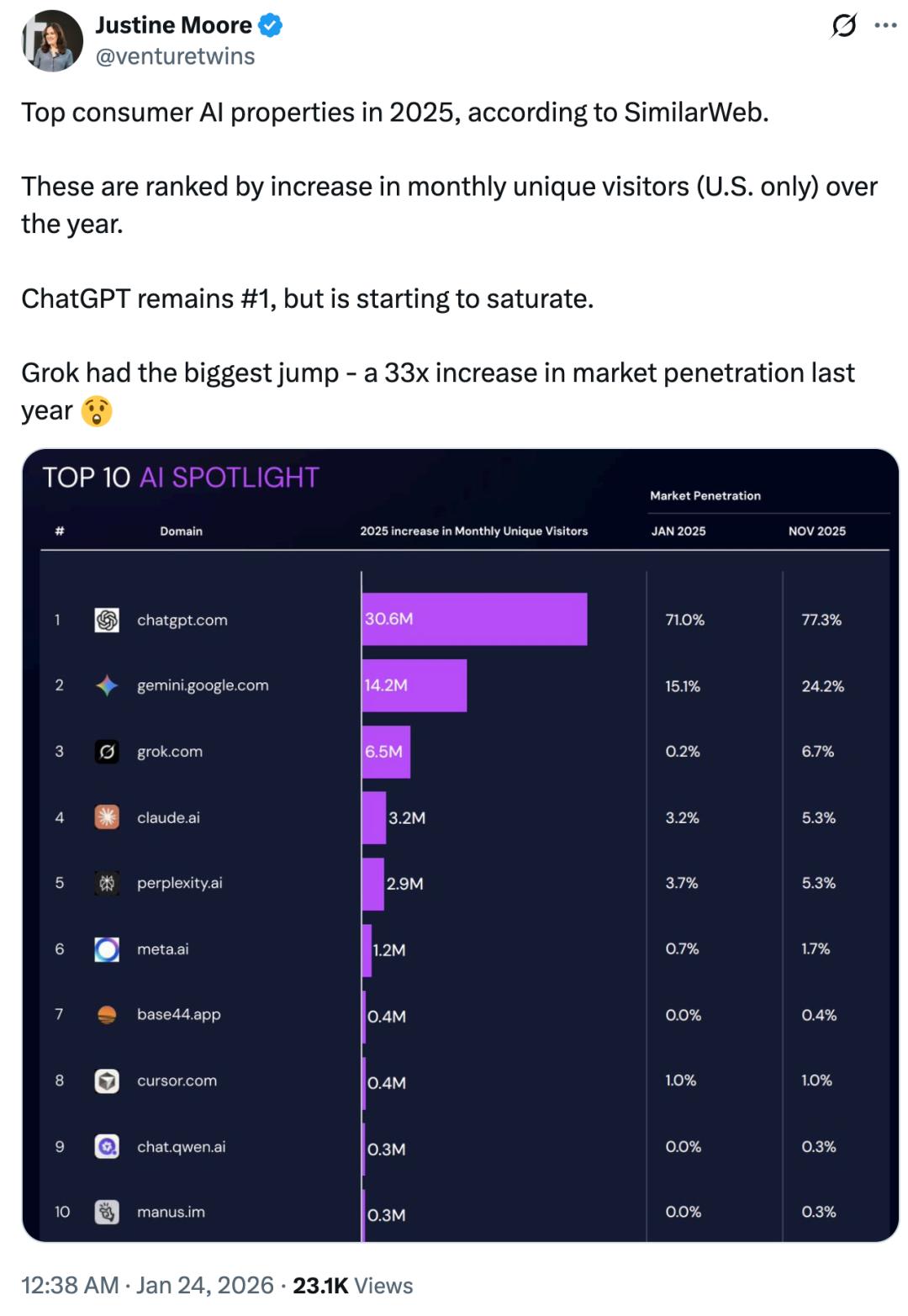 其中 ChatGPT 每月独立访客(MUV)增长达 3060 万,渗透率从 1 月的 71% 增长到 11 月的 77.3%;谷歌 Gemini 增长了 1420 万月活, 渗透率从 15.1% 跃升至 24.2%,增幅最大;Grok 渗透率也从 0.2% 飙升至 6.7%;Claude 的 MUV (320 万)和渗透率(5.3%)也在稳步增长。