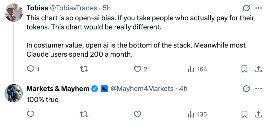 在评论区,还有人指出了更多问题,包括高净值客户的流失,「从客户价值的角度来看,OpenAI 其实处于垫底水平。相比之下,大多数 Claude 用户每个月的开销都在 200 美元左右。」