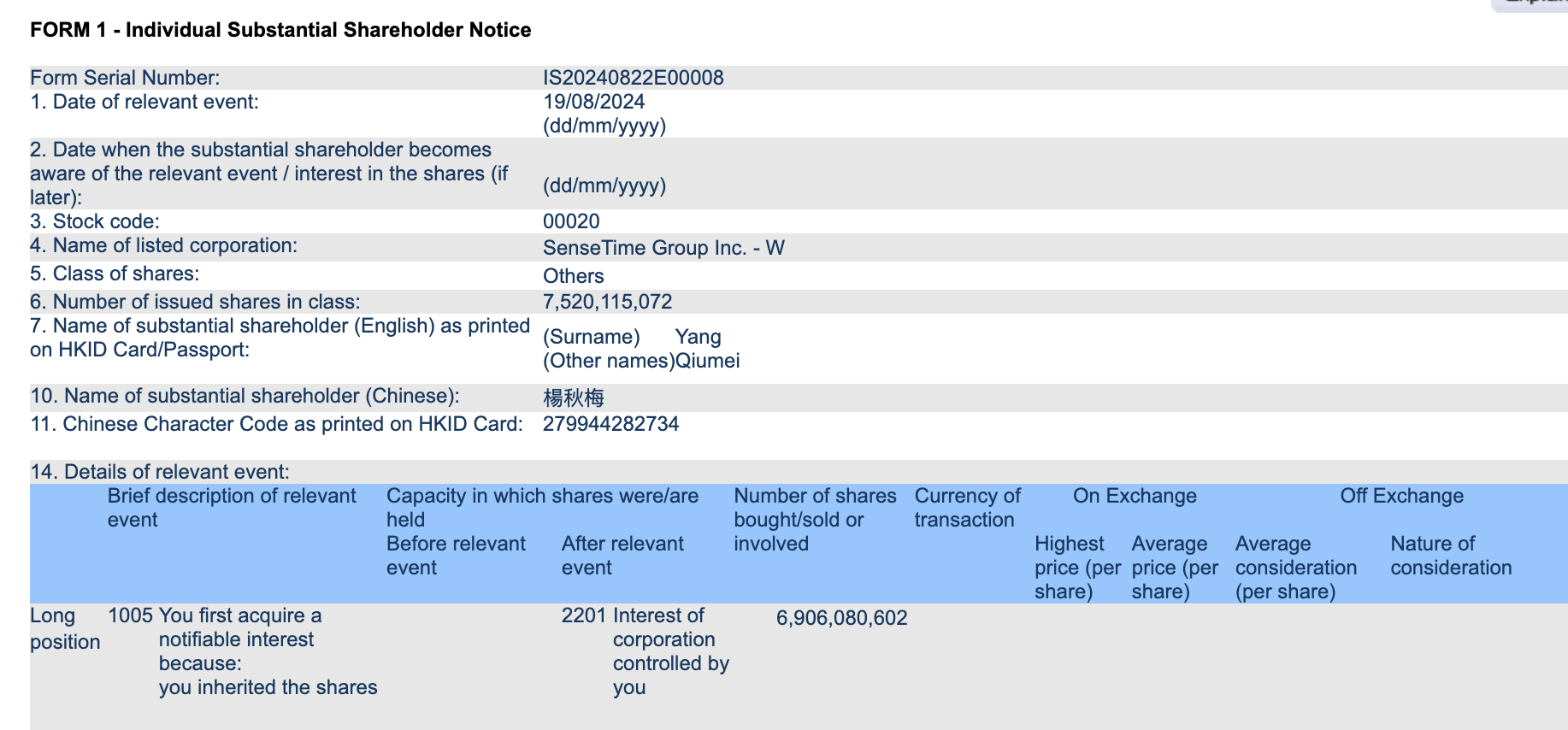 根据今年8月港交所披露的监管文件,杨秋梅继承了汤晓鸥所持有的20%商汤科技股份,目前价值15亿美元。文件显示,今年8月19日,超过69亿股未上市的商汤科技A类股被转移给了杨秋梅。八天后,同样数量的股份被转换成了在香港上市的商汤科技B类股,约占商汤科技所有已发行A类股和B类股的20%,这让杨秋梅成为了商汤科技的最大股东。按照规定,港交所员工需要在内部申报持有的香港证券。