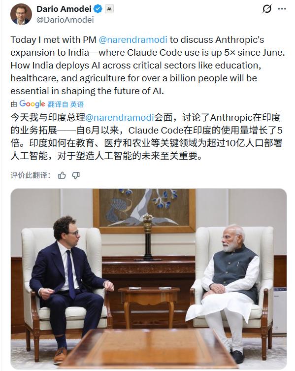 图:Anthropic CEO达里奥·阿莫代伊与印度总理莫迪会面