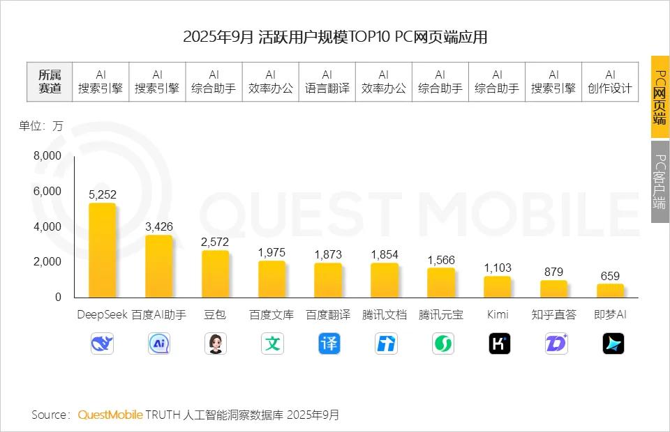 QuestMobile数据显示,截至2025年9月,百度文库PC网页端月活跃用户约为1975万,低于DeepSeek的5252万、豆包的2572万,略高于腾讯元宝的1566万。