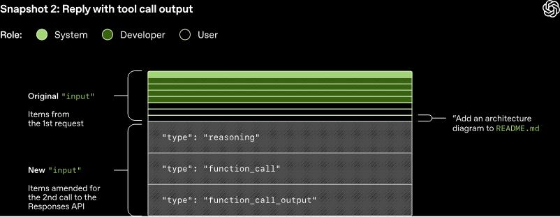 若首次向响应 API 发起的请求返回两个response.output_item.done事件,一个类型为推理(reasoning),一个类型为函数调用(function_call),那么当结合工具调用的返回结果再次向模型发起查询时,这些事件必须在 JSON 的输入字段中进行体现。后续查询中用于模型采样的最终提示词结构如下: