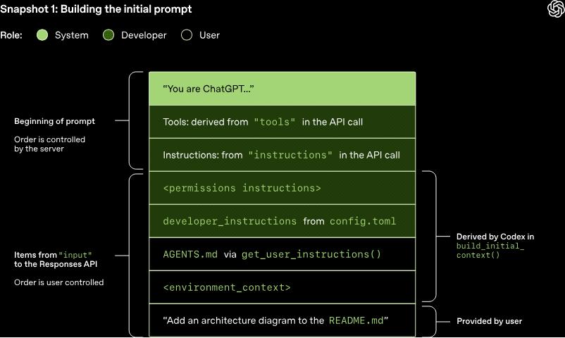 Codex 不会把用户的话直接给大模型用,而是会主动“拼接”出一整套精心设计的提示词结构,且涵盖多个角色的指令、用户输入的一句话在结尾才出现。