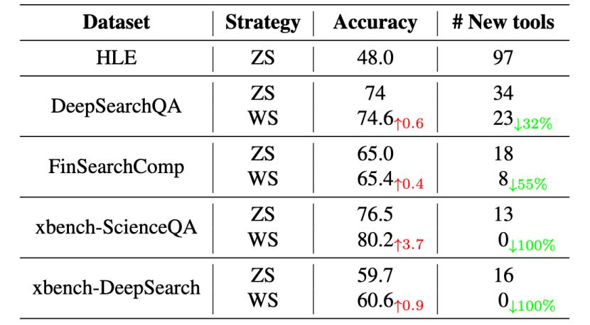 再看这张图更直观——两种策略下的Agent性能统计对比,ZS代表从零工具起手,WS代表前面说的按数据集顺序的知识迁移策略。