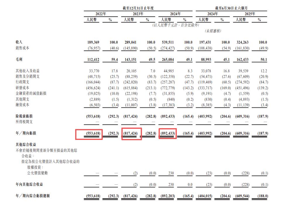 招股书显示,该公司在2022年至2024年,其净亏损分别为人民币5.54亿元、8.17亿元及8.92亿元,三年累计亏损超22亿元。2025年上半年亏损额仍高达6.09亿元。