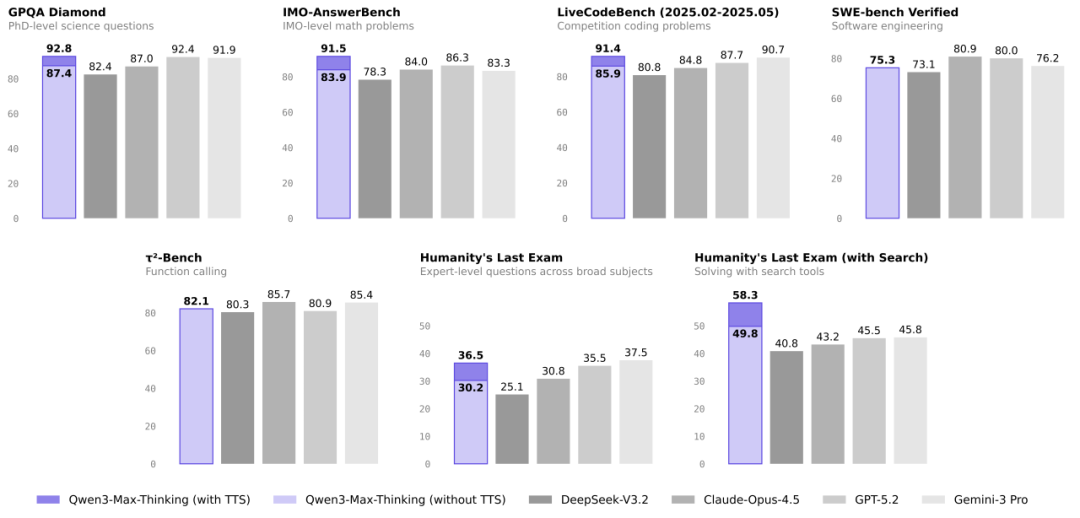 根据官方介绍,Qwen3-Max-Thinking 刷新了数项最佳表现(SOTA)纪录,特别在科学知识(GPQA Diamond)、数学推理(IMO-AnswerBench)、代码编程(LiveCodeBench)等多项关键性能基准测试中表现优异,达到国际领先水平。