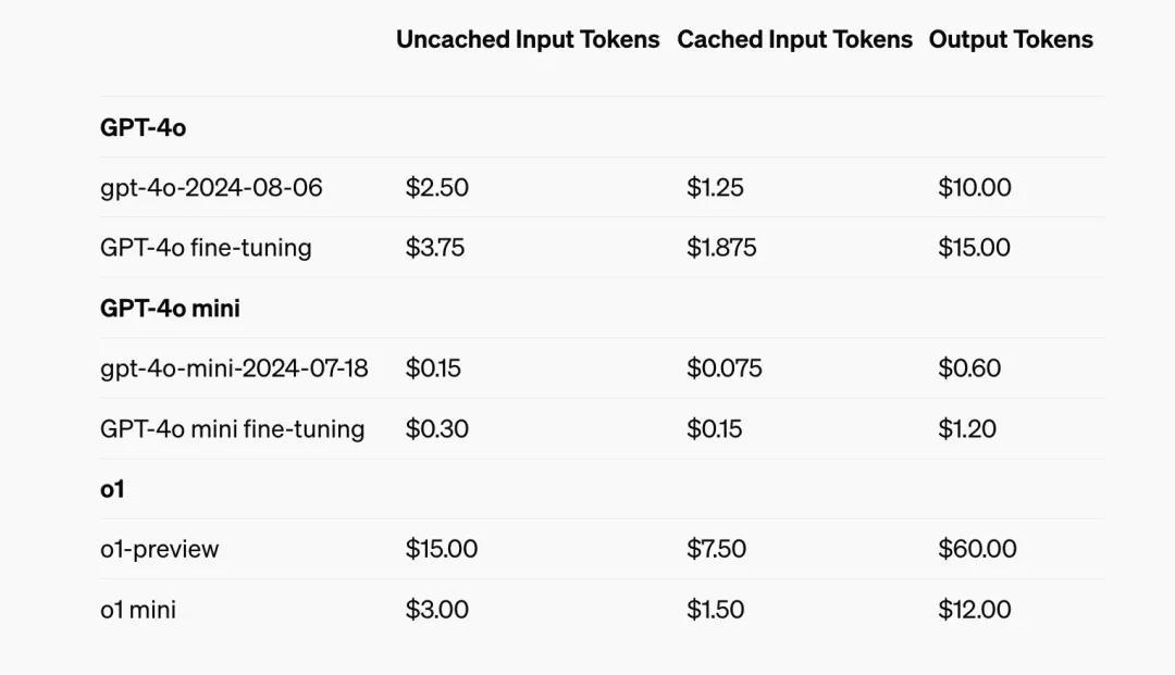 提示缓存的可用性与定价 从今天起,提示缓存将自动应用于GPT-4o、GPT-4o mini、o1-preview和o1-mini的最新版本,以及这些模型的微调版本。与未缓存的提示相比,缓存的提示提供了折扣。