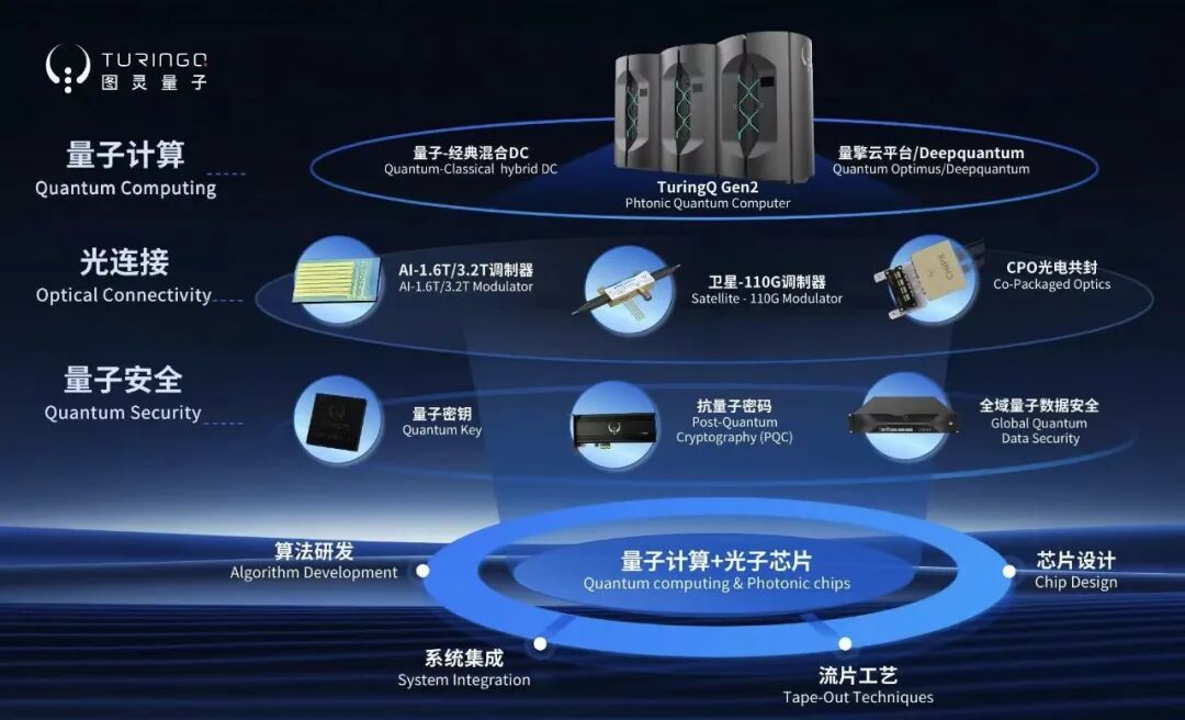 核心产品:图灵量子以“光子芯片+量子计算”双核底层技术,致力于推动光量子计算产业化,构建了全栈自主可控的软硬件一体产品体系。核心产品TuringQ Gen2大规模可编程光量子计算系统以及全栈自主可控量子-经典混合智算解决方案,业务涵盖量子计算、光连接、量子安全三大战略板块,赋能金融科技、生物医药、人工智能等前沿领域。