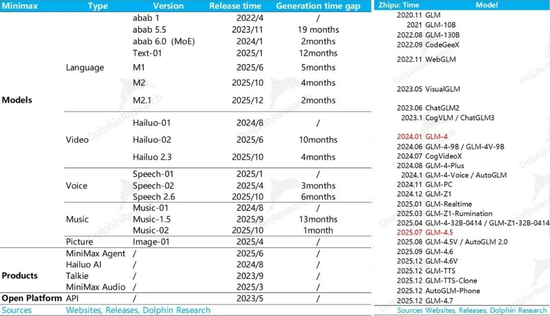 两个大模型公司Minimax和智谱,都是“短小精悍”型——人手少、产品迭代快,收入增长快。人数到2025年下半年没超一千人,收入零起步,两三年年化收入都在快速迈向一亿美金。