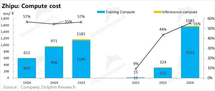 但智谱的情况就是一个非常明显的收入高增,但对训练成本的回收能力,因为训练成本增长斜率更高,反而越来越弱。