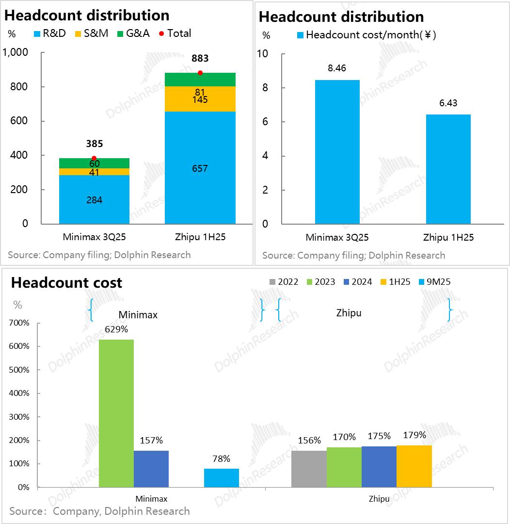 两个公司员工整体都没超1000人,尤其是Minimax都不足400人;两家公司研发人员都接近75%,单人头月成本6.5-8.5万元人民币(不含期权激励),其中Minimax研发人员单人月成本是16万。