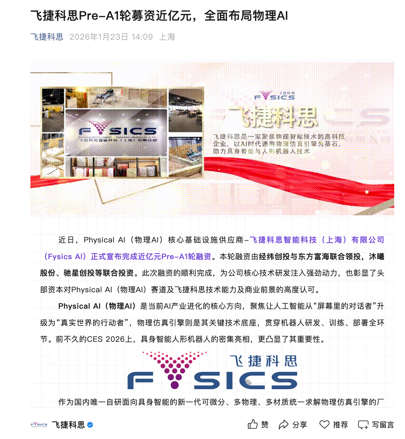 凤凰网科技讯 1月27日,飞捷科思智能科技(上海)有限公司近日宣布完成近亿元Pre-A1轮融资。本轮融资由经纬创投与东方富海联合领投,沐曦股份、驰星创投等机构参与投资。