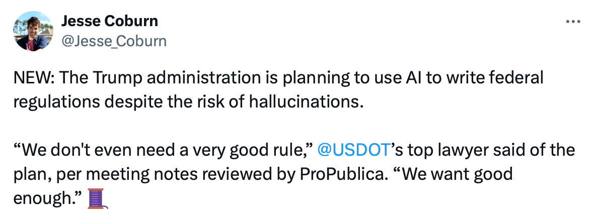 目前 DOT 已使用 AI 起草了一项未公开的联邦航空管理局规则草案,后续计划将 AI 推广至其他政府部门。