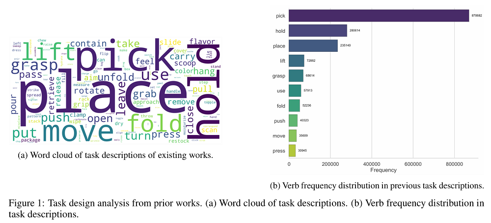 任务设计过程中,研究团队先对人类与物体的交互原语进行了系统分析,然后借助大语言模型生成候选任务,再经过专家筛选与优化,最终形成100个任务。这些任务从日常常见到罕见,从简单到复杂。