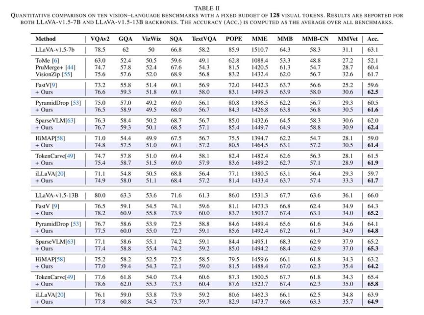 在系统实验中,该团队将attention去偏策略作为plug-and-play模块,集成到多种主流attention-based visual token pruning方法中进行评估。实验覆盖6种pruning baselines,在 多个主流VLM(7B/13B)上进行测试,并验证于10个图像理解任务与3个视频理解任务。