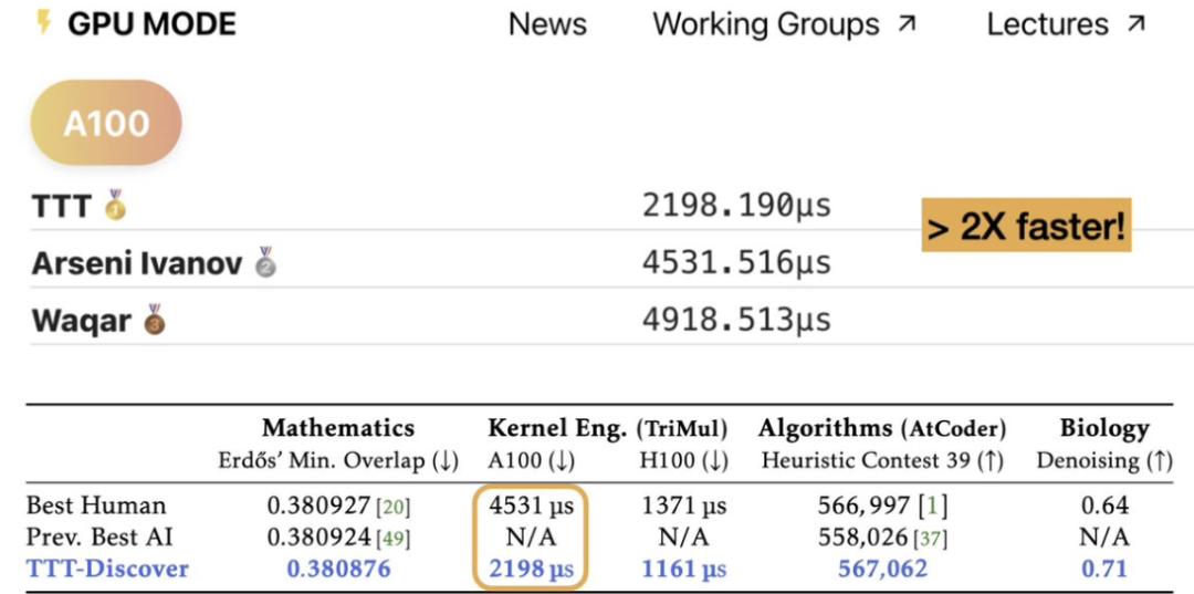 在实验阶段,研究基于开源模型gpt-oss-120b,通过Tinker API运行,单个问题的测试成本约为数百美元。值得一提的是,正如开头展示的,在kernel内核编写任务中,TTT-Discover的速度比当前最佳人类实现快约2倍*。