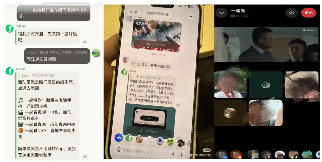 但这种功能是可以在迭代中快速完善的,而海豚君从元宝套话中也得知,后续还有更多的 “派对” 功能。而春节期间的现金红包,也可能是元宝在各个 “派” 中突然撒红包和功能体验卡,来调动元宝派内的活跃度。