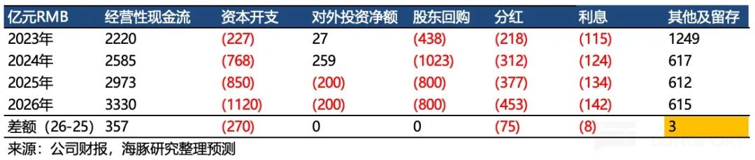 在没有额外必需的投资/运营支出计划的假设下,如下图我们类比 2024、2025 年「其他及留存」项的配置规模,测算腾讯在 2026 年的资本开支预算空间最高可以超过 1100 亿,同比增长 32%。这只是可用现金流角度,具体采购多少、确认到货多少,还得看实际供给情况。