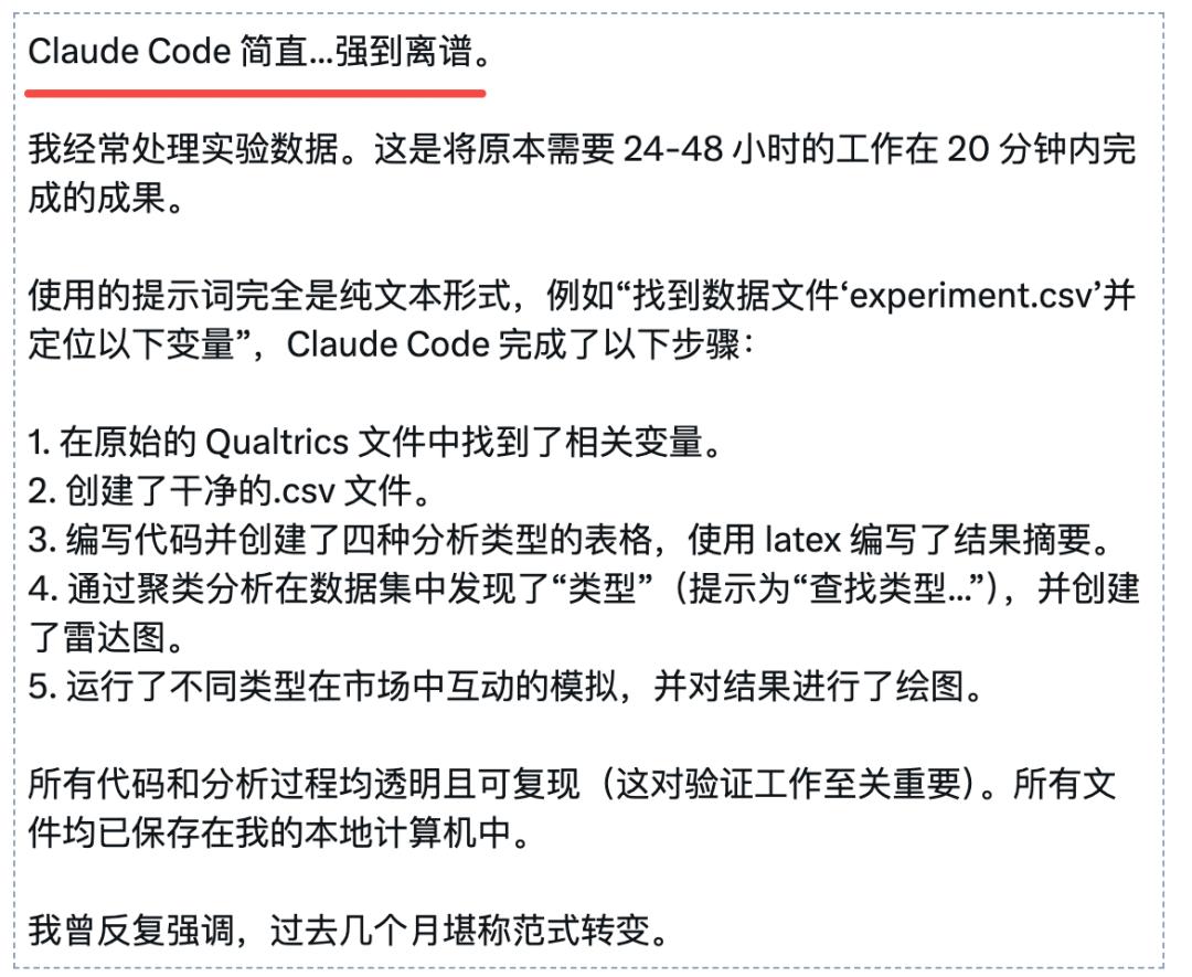 「Claude Code简直疯了。我经常处理实验数据,原本需要24-48小时的工作量,它20分钟就搞定了。」
