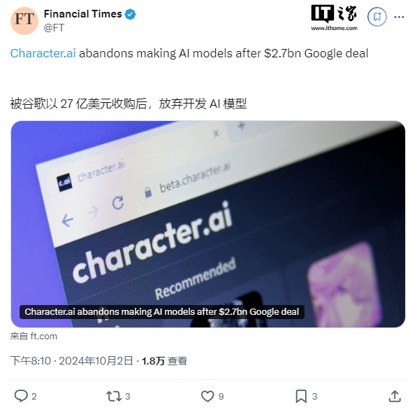 今年 8 月,谷歌以 27 亿美元(IT之家备注:当前约 189.67 亿元人民币)将两位创始人与该公司 20% 的员工挖走。
