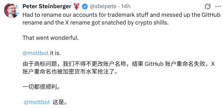 在重命名过程中,GitHub 平台出现故障,导致 Peter 的个人账号一度报错。更糟糕的是,在其 X 账户重命名的短短 10 秒内,旧 ID「@clawdbot」便被加密货币骗子迅速抢注。