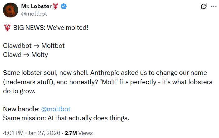 昨天下午,Clawdbot 已正式宣布更名为Moltbot。