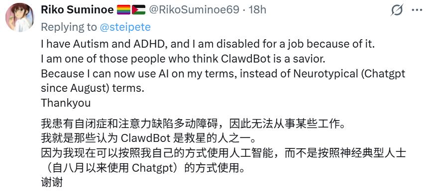 一些患有自闭症和 ADHD(注意缺陷多动障碍)的用户在社交媒体上分享了自己的故事。对于他们而言,Moltbot 就像是一个「救星」,因为它允许用户按照自己的需求去定义和使用人工智能,而不是被动接受大型公司为「神经典型人士」设计的交互逻辑。