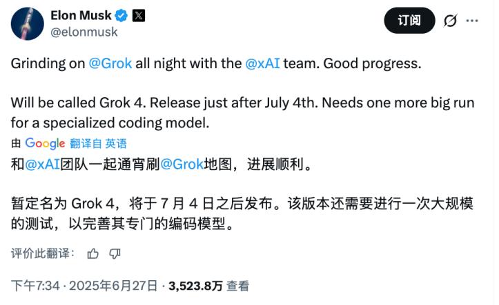 马斯克也曾经发文称,因为Grok 4要发布了,和xAI的成员一起通宵干活。