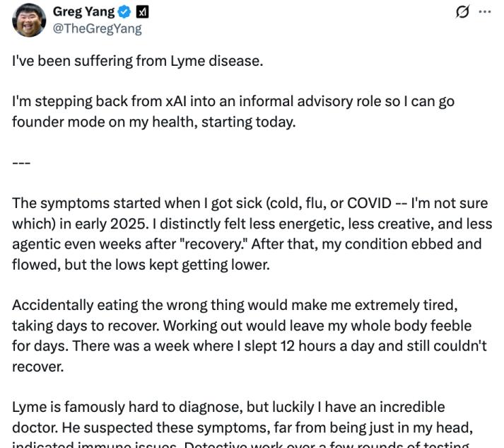 因为在xAI的工作强度太大,免疫力下降,莱姆病发作,他将退出日常工作,转为公司的“顾问”。