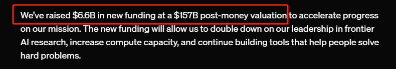 ①美国人工智能公司OpenAI在官网宣布,其在最新一轮融资中筹集了66亿美元,融资后估值达到1570亿美元;②如果按1570亿美元的估值上市,OpenAI的市值将超过顶级投行高盛集团和全球最大的移动出行公司优步。
