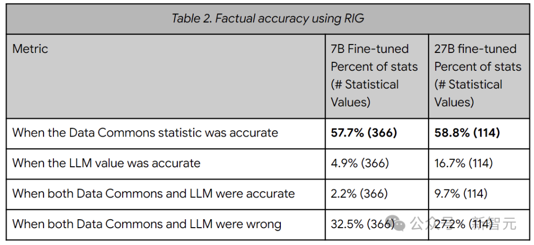 上表显示了 RIG 方法的事实准确性指标(Data Commons 中的统计数据与 101 个查询中的 LLM 响应进行比较的情况)。总体而言,RIG 方法提高了真实性,从 5-17% 提高到约 58%。