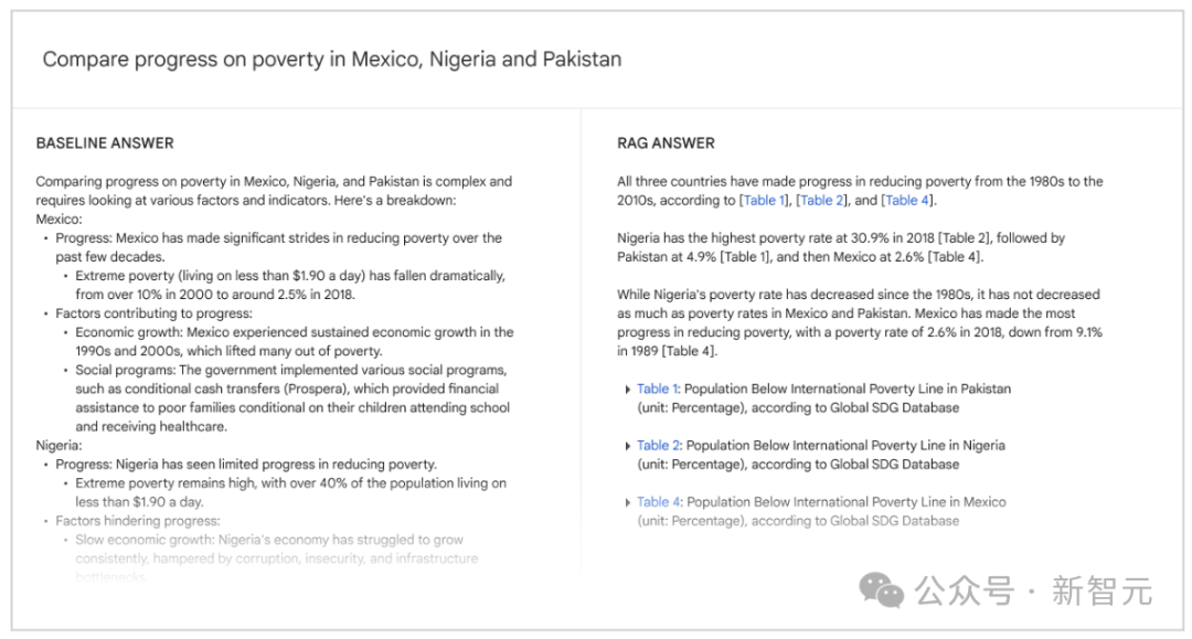 RAG 管道同样包含多个组件。首先,用户查询被传递到一个小型的、经过微调的 LLM,它会生成与用户查询相关的自然语言查询;然后,通过 Data Commons 的自然语言接口来获取相关的表;最后,将原始用户查询和检索到的表交给长上下文 LLM(Gemini 1.5 Pro)。