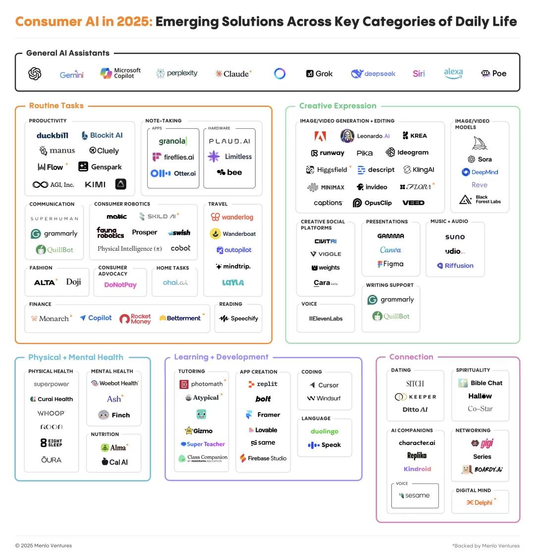 硅谷风投机构 Menlo Ventures 在《2025年消费级AI现状报告》中指出,自 ChatGPT 发布后的两年半内,消费级AI已汇聚近20亿用户,但整体市场规模仅约120亿美元。按每月20美元的平均订阅费算,还有4200亿美元的空白。