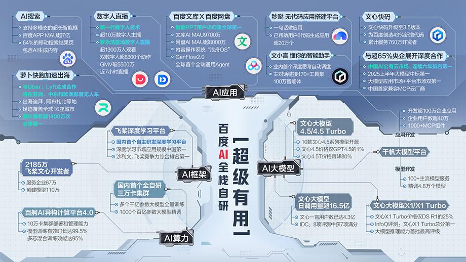 其实论技术实力,百度是国内少有的全栈型AI公司,自研芯片、算力集群、训练平台、大模型与行业应用一应俱全,文心大模型与智能体平台支撑起百度横跨诸多场景的AI应用矩阵。