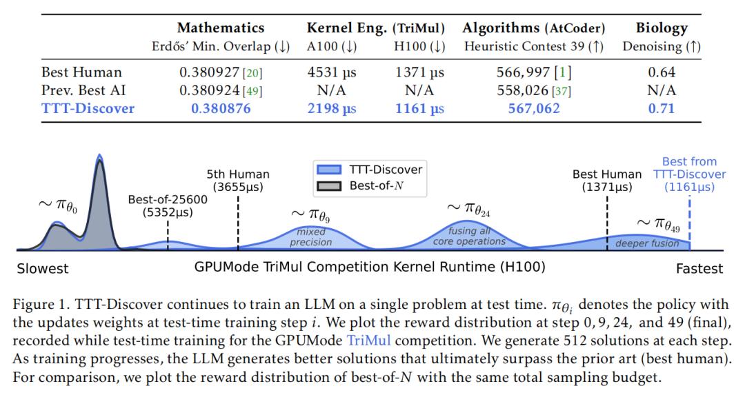 团队在四个截然不同的领域 —— 数学、GPU 内核工程、算法设计和生物学问题上评估了 TTT-Discover。