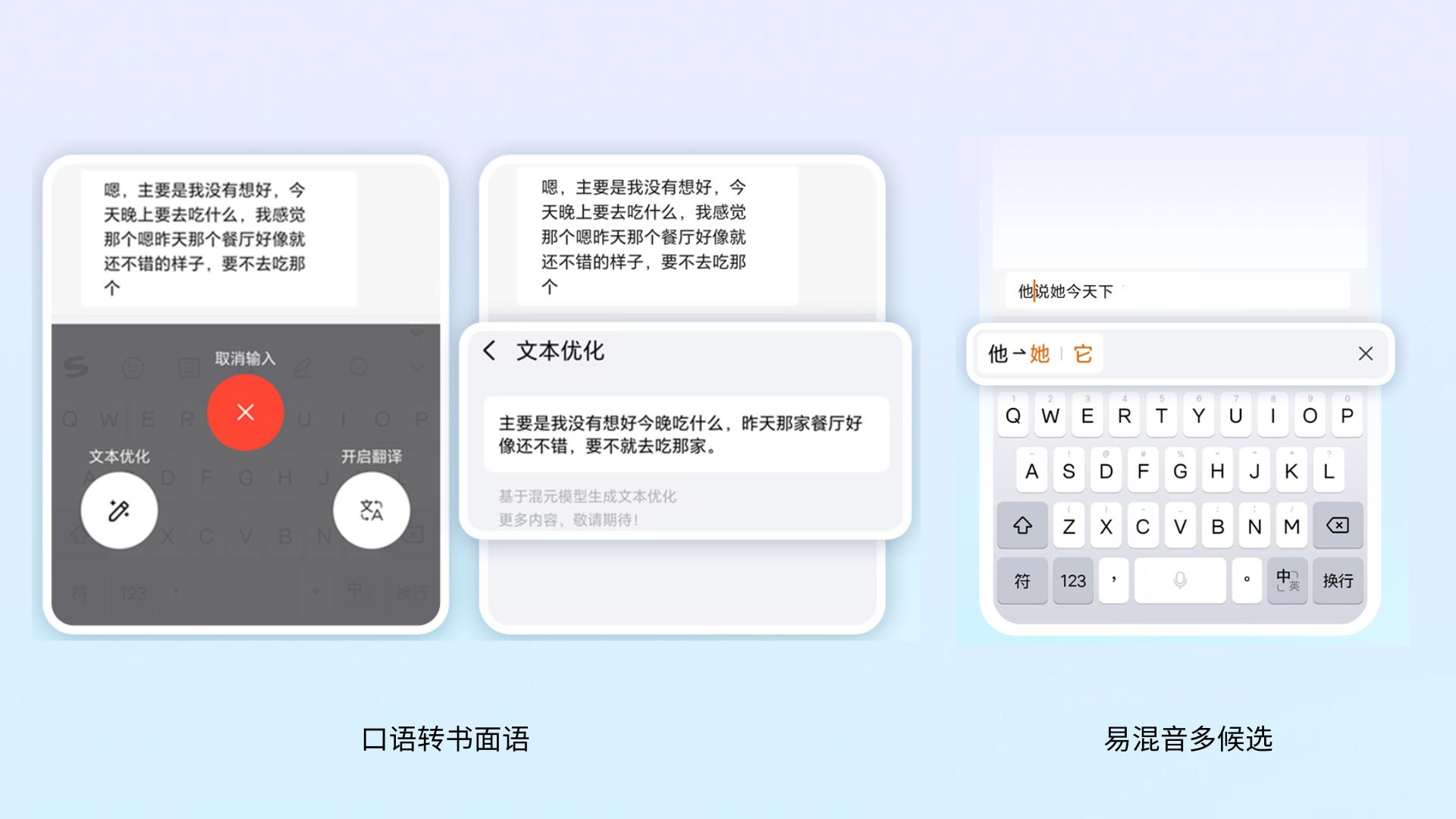 AI语音则是本次升级的核心。基于自研的AI语音大模型,新版本实现了语音识别流畅性、整体识别准确率和方言识别准确率的提升。此外,新版本还推出了“口语转书面语”和易混音修改功能,针对语音输入中常见的“他她它”、“的地得”等易混音问题提供了候选和替换方案。