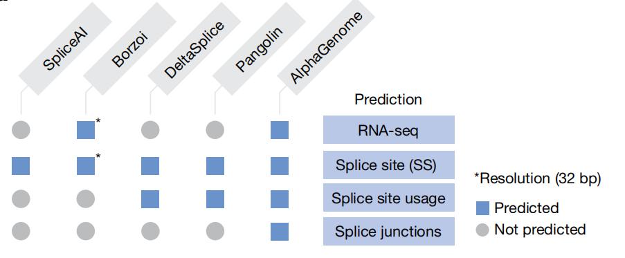 图|深度学习模型预测输出对比。除 Borzoi(32 bp)外,所有模型均以 1 bp 分辨率进行预测。Borzoi 通过 RNA-seq 覆盖度隐含预测剪接位点,而其他模型则生成明确预测结果。