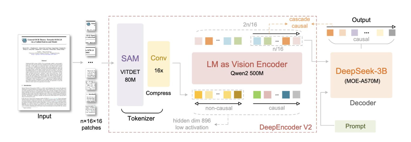 相比一代,OCR 2 的关键变化不只是压缩率,而是引入了更接近人类阅读习惯的逻辑,从上一代的 CLIP(切片)架构转向以 Qwen2 为基础的 LM(语言模型)视觉编码器。模型不再是同时、平均地处理整页内容,而是学会区分结构: