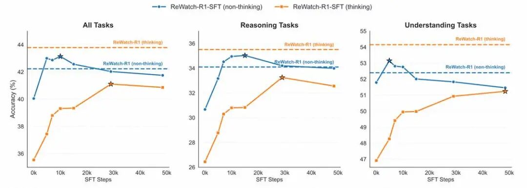 一个非常有趣的发现是:在监督微调(SFT)阶段,“思考模式”的性能始终无法超越“直接回答”模式。这说明SFT只能教会模型思考的“形”,而无法领悟其“神”。