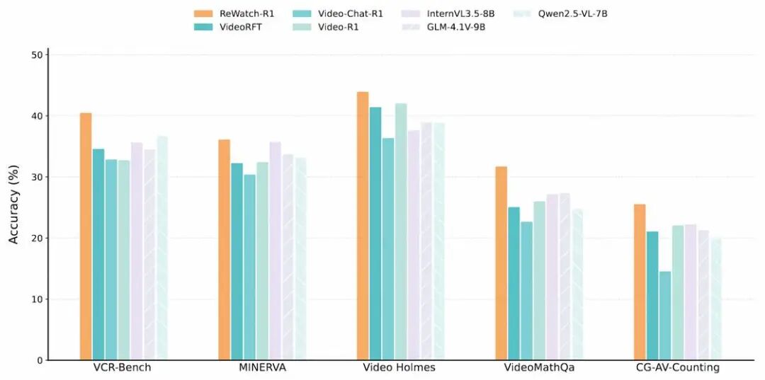 实验结果表明,ReWatch-R1在五个主流视频推理基准上,平均性能显著超越了所有同量级的开源模型,取得了SOTA的成绩,证明了该方法论的有效性。