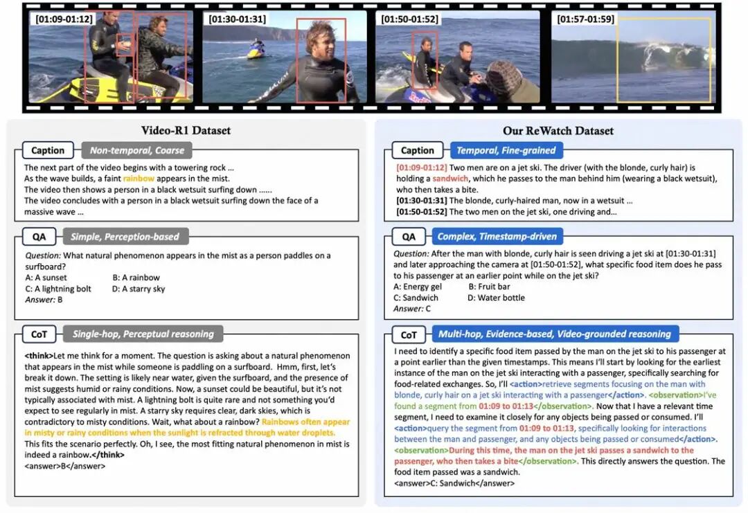 研究团队发现,现有训练数据存在三大痛点:视频描述粗糙、问答过于简单、思维链(CoT)严重依赖文本常识而非视频内容。为此,他们构建了一个包含1万视频、17万问答对和13.5万思维链的ReWatch数据集,它具备三大核心优势: